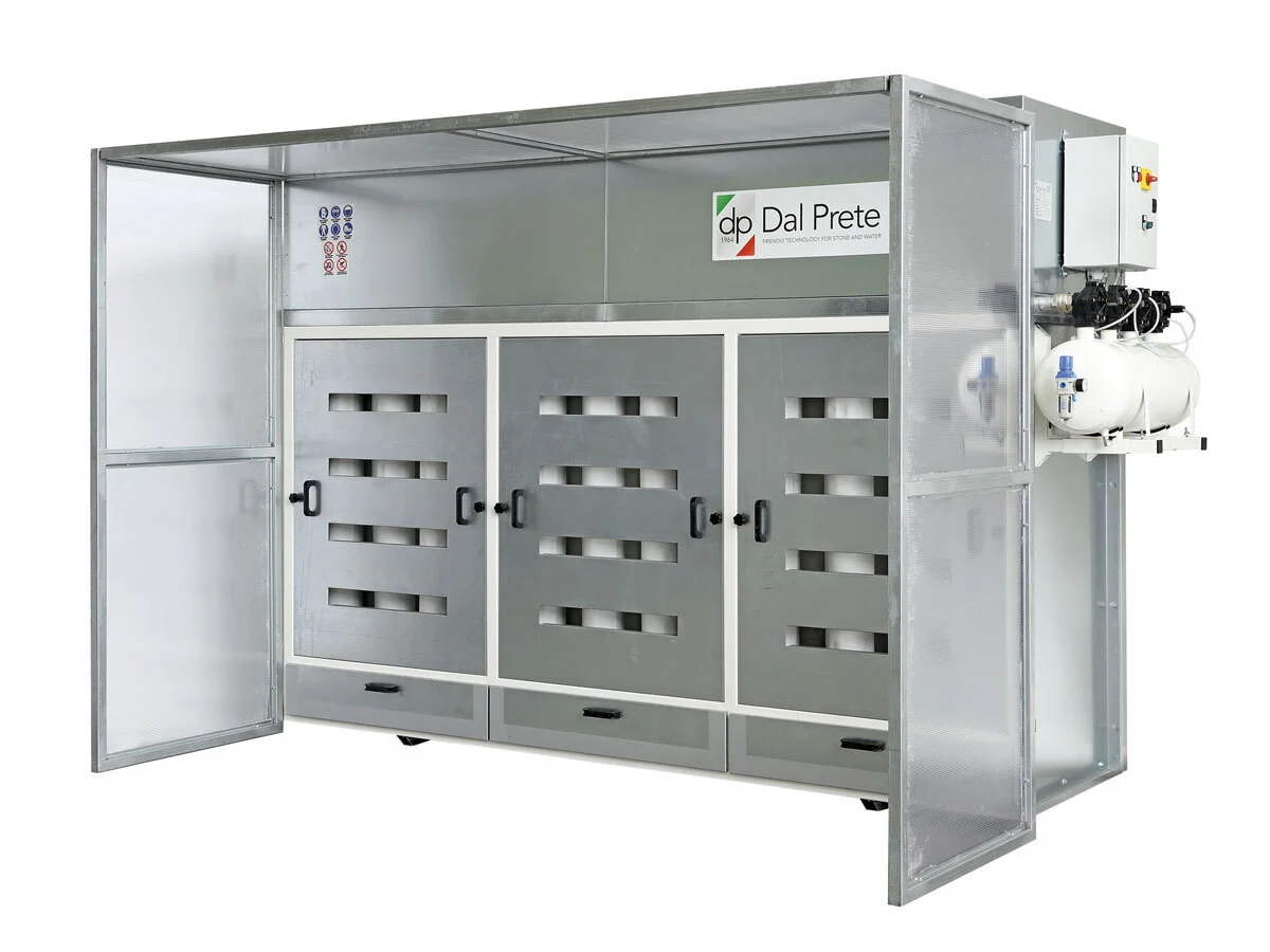 The DRY model wall air purifier works in a simple way: the air charged with dust, sucked in by the internal fans, passes through batteries of sock filters that retain the dust and drop it into the drawers below.