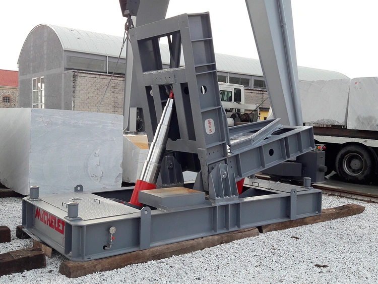 Machine to tilt big dimensions blocks, thanks to the action of hydraulic cylinders operated by a special circuit designed to ensure ease of operation and safety of use. The tilting is controlled by a mobile push-button panel provided with cable automatic rewinder.