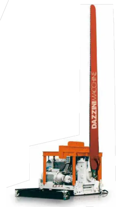 not the entire amount of the tank, so that to avoid loss and waist of unused oil during the cutting phase. Thanking to an air/oil heat exchanger, the machine can work also in some geographical areas, where the particular environment conditions – desert (with temepratures upper than 50°C) or lack of water on the quarry site - oblige to work dry. The lifting hoist, with different possibilities for slinging and lifting, allows positioning the chain saw machine on every plane (even high inclination